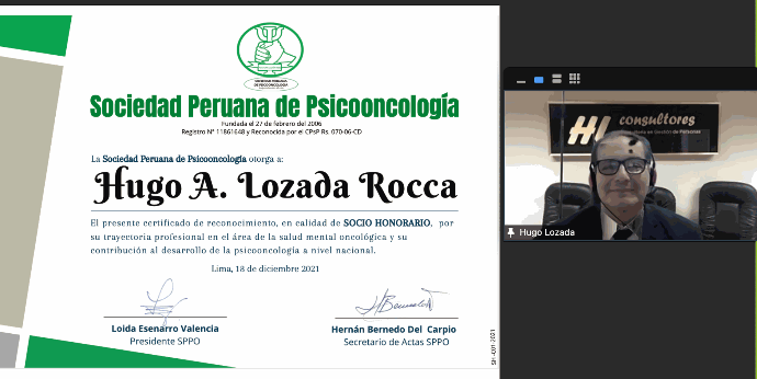 Nominado socio honorario por el Psicólogo Lenin Orrillo Ledesma, past president de la Sociedad Peruana de Psicooncología en el año 2018.
